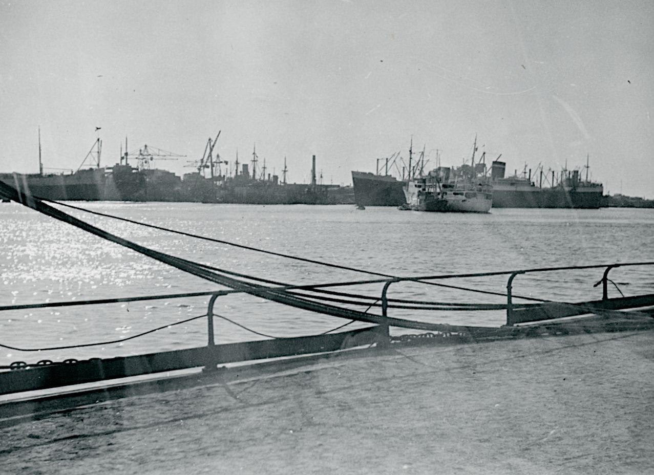 Maskingenkendt tekst fra fotokuvert: Foto taget over mod B & W. Det er ikke muligt at se,hvilke skibe, der ligger der og hvorfor.