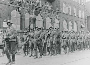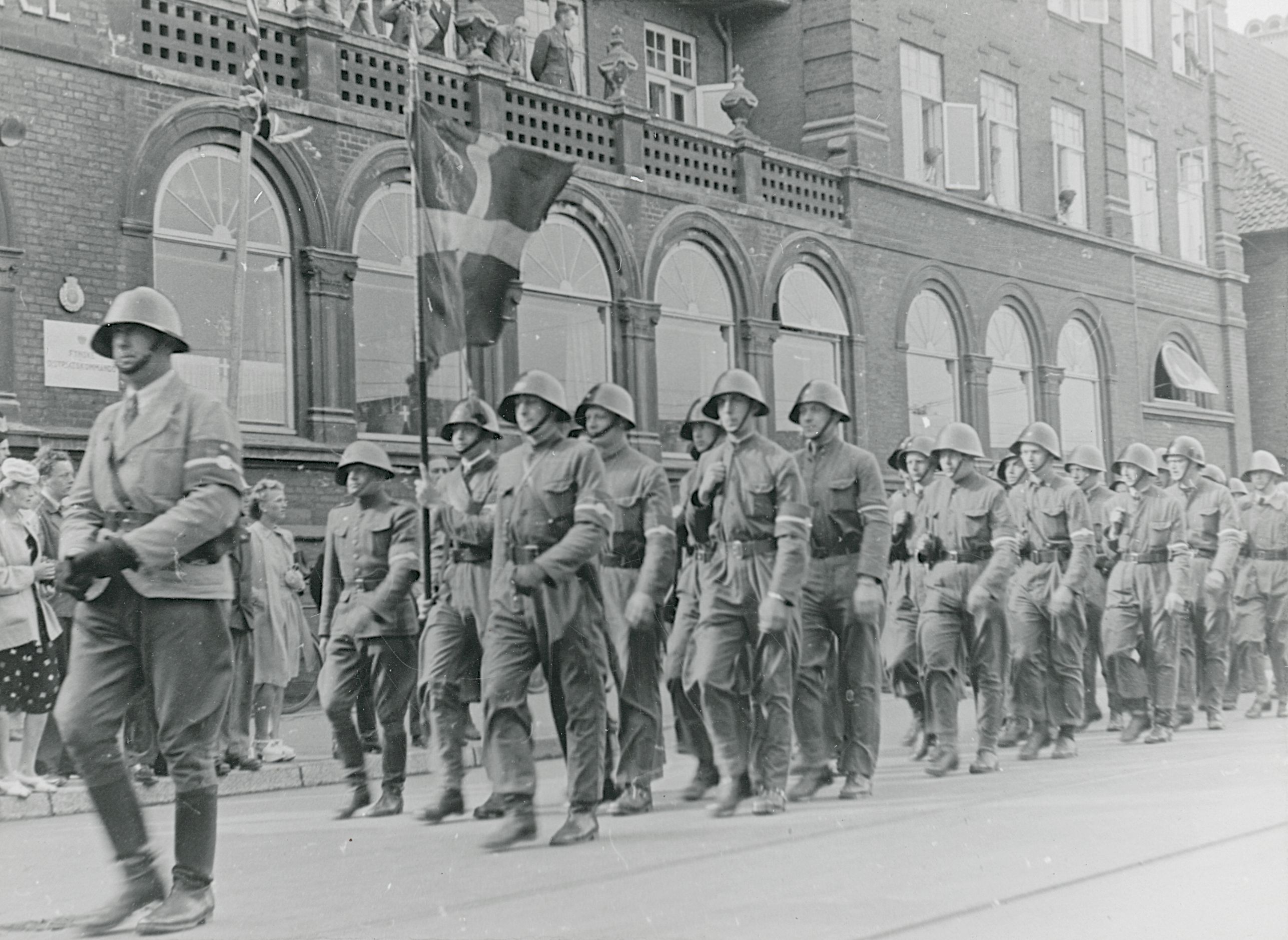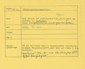 Maskingenkendt tekst fra fotokuvert: Modstandsfolk, militære og civile v. parader.