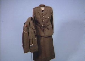 Engelske uniformer for kvindekorpset A.T.S. med gradstegn for underkorporal og rødt stofmærke med ”Danmark” skrevet i hvidt
