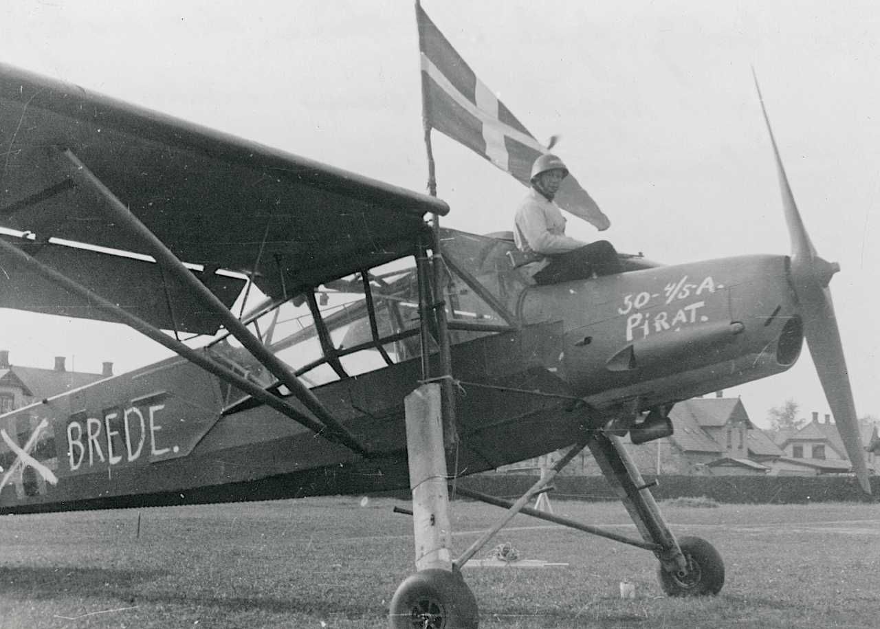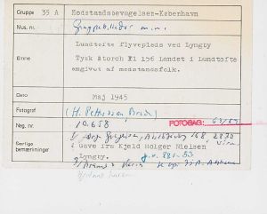 Maskingenkendt tekst fra fotokuvert: Lundtofte flyveplads ved Lyngby Tysk Storch Ei 136 Landet i Lundtofte omgivet af modstandsfolk.