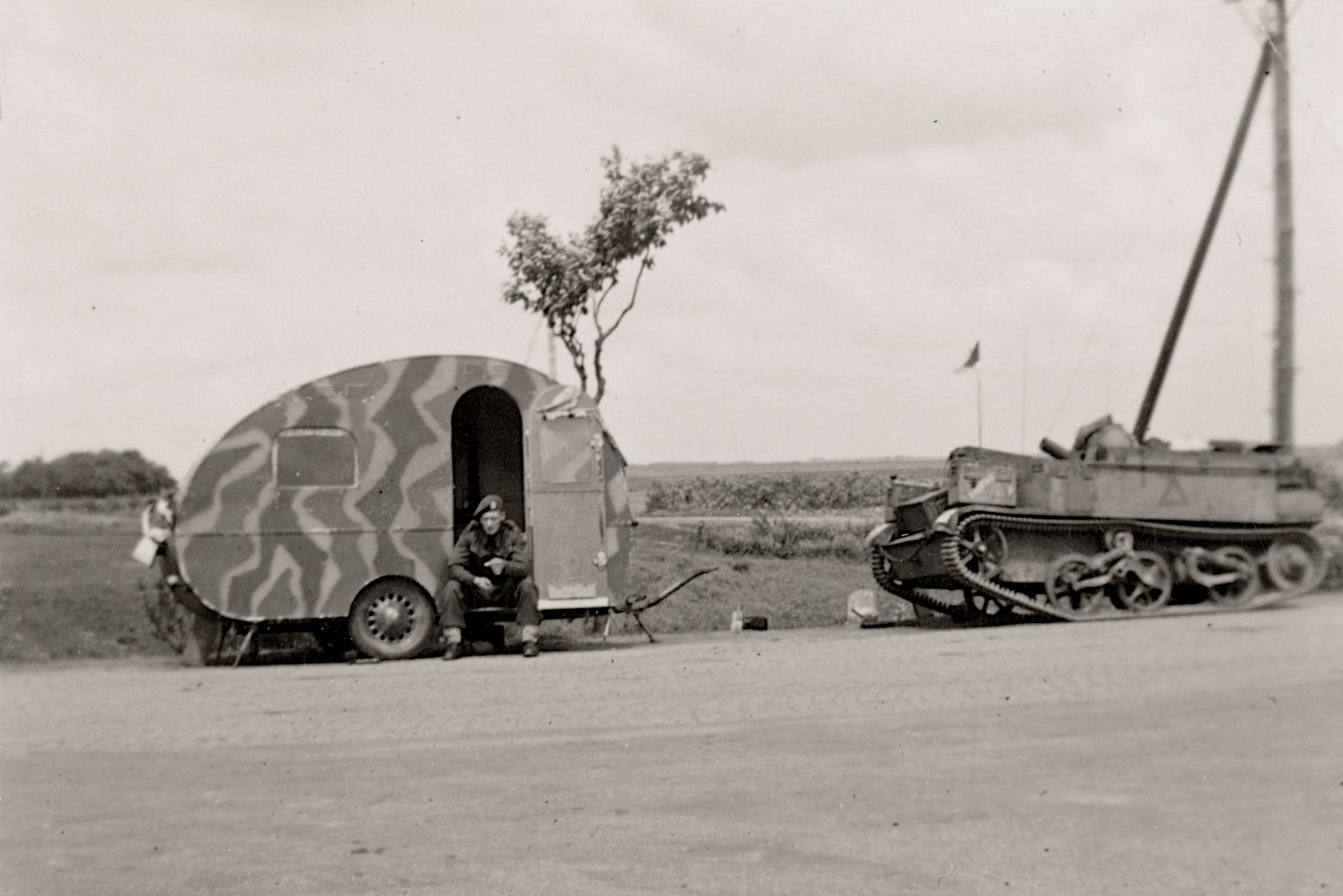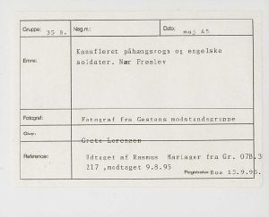 Maskingenkendt tekst fra fotokuvert: Kamufleret påhængsvogn og engelske soldater. Nær Frøslev