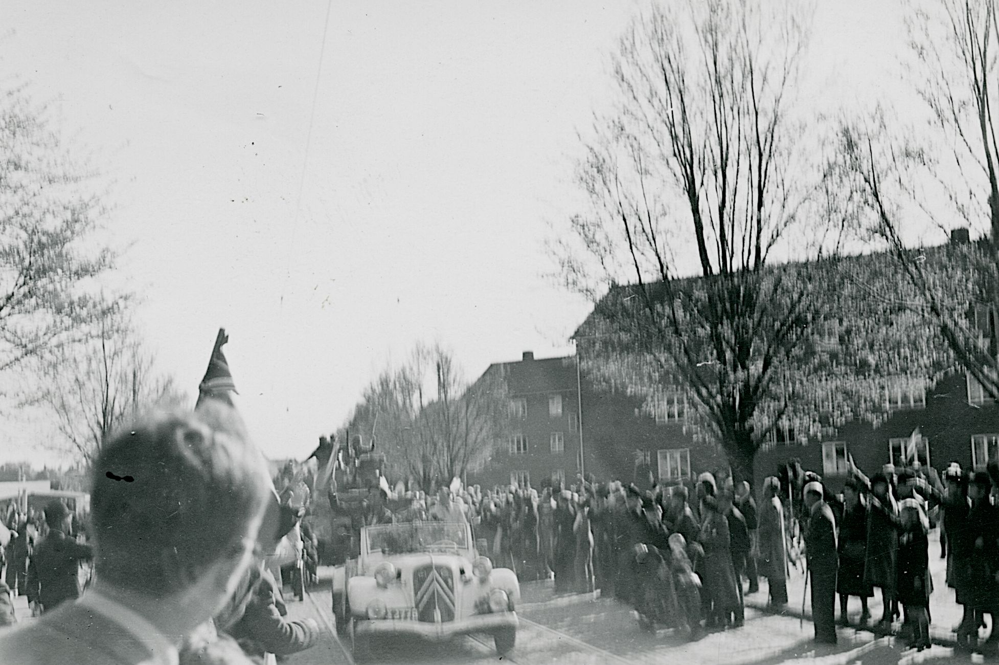 Maskingenkendt tekst fra fotokuvert: Allierede tropper (?) et sted i København. Det ligner Sallingvej ved Ådalshusene.