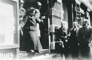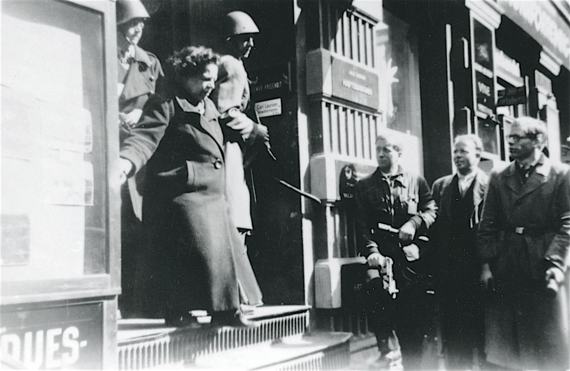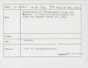Maskingenkendt tekst fra fotokuvert: Redaktøren af "Kamptegnet", Olga von Eggers arrestation, Holbergsgade 17. Olga von Eggers boede på 1. sal.