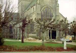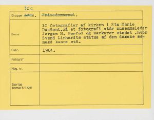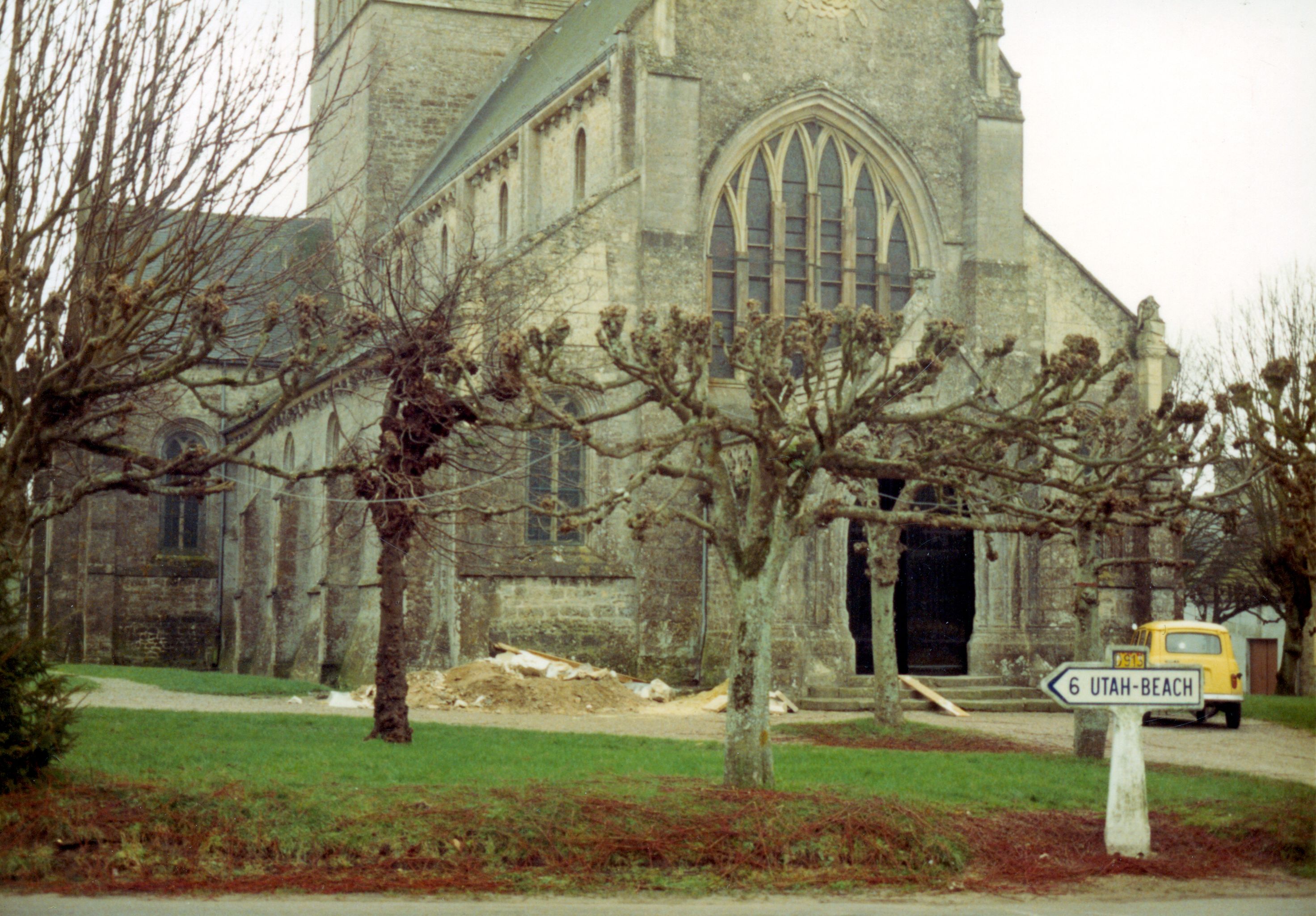 Maskingenkendt tekst fra fotokuvert: Kirken i Skt. Marie Du-Mont. Museumsleder Jørgen H. Barfod markerer stedet , hvor Dr Svend Linhardts statue af den danske sømand kunne stå.