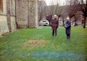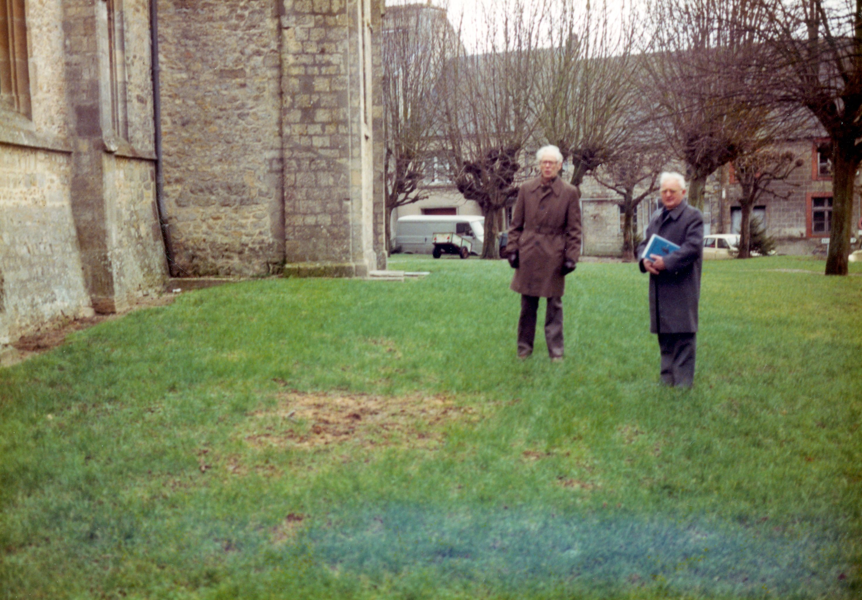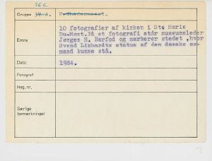 Maskingenkendt tekst fra fotokuvert: Kirken i Skt. Marie Du-Mont. Museumsleder Jørgen H. Barfod markerer stedet , hvor Dr Svend Linhardts statue af den danske sømand kunne stå.