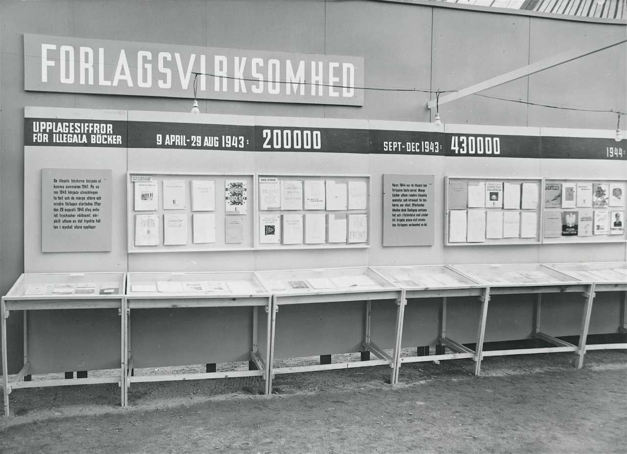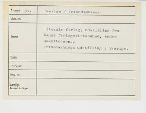 Maskingenkendt tekst fra fotokuvert: Illegale forlag, udstilling fra Dansk forlagsvirksomhed, under besættelsen. Frihedsrådets udstilling i Sverige.