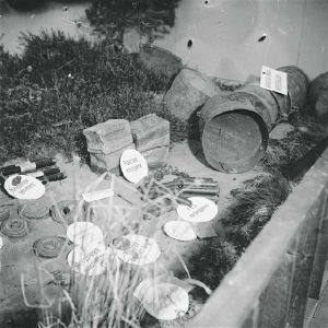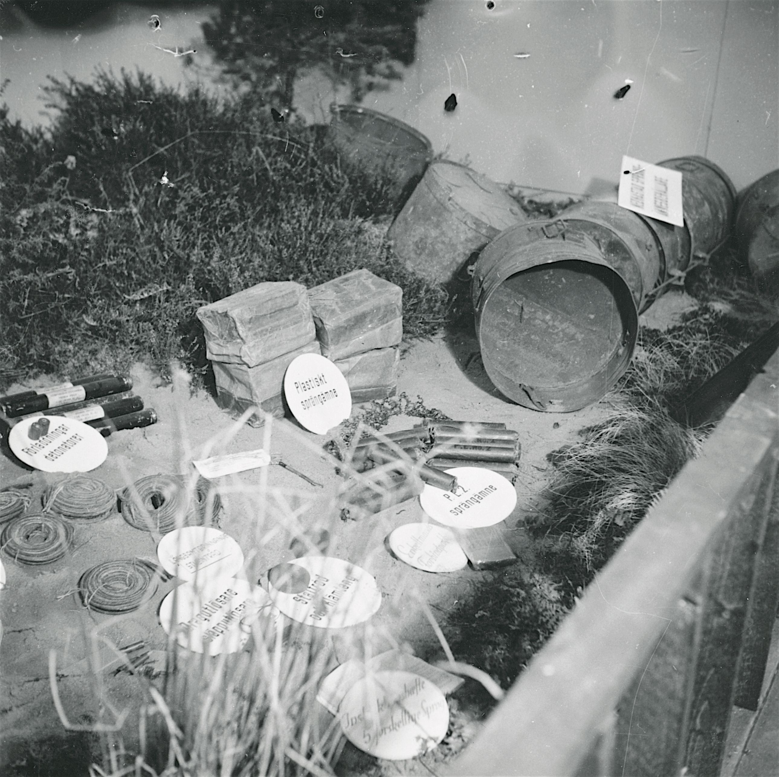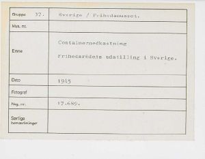 Maskingenkendt tekst fra fotokuvert: Containernedkastning Frihedsrådets udstilling i Sverige.