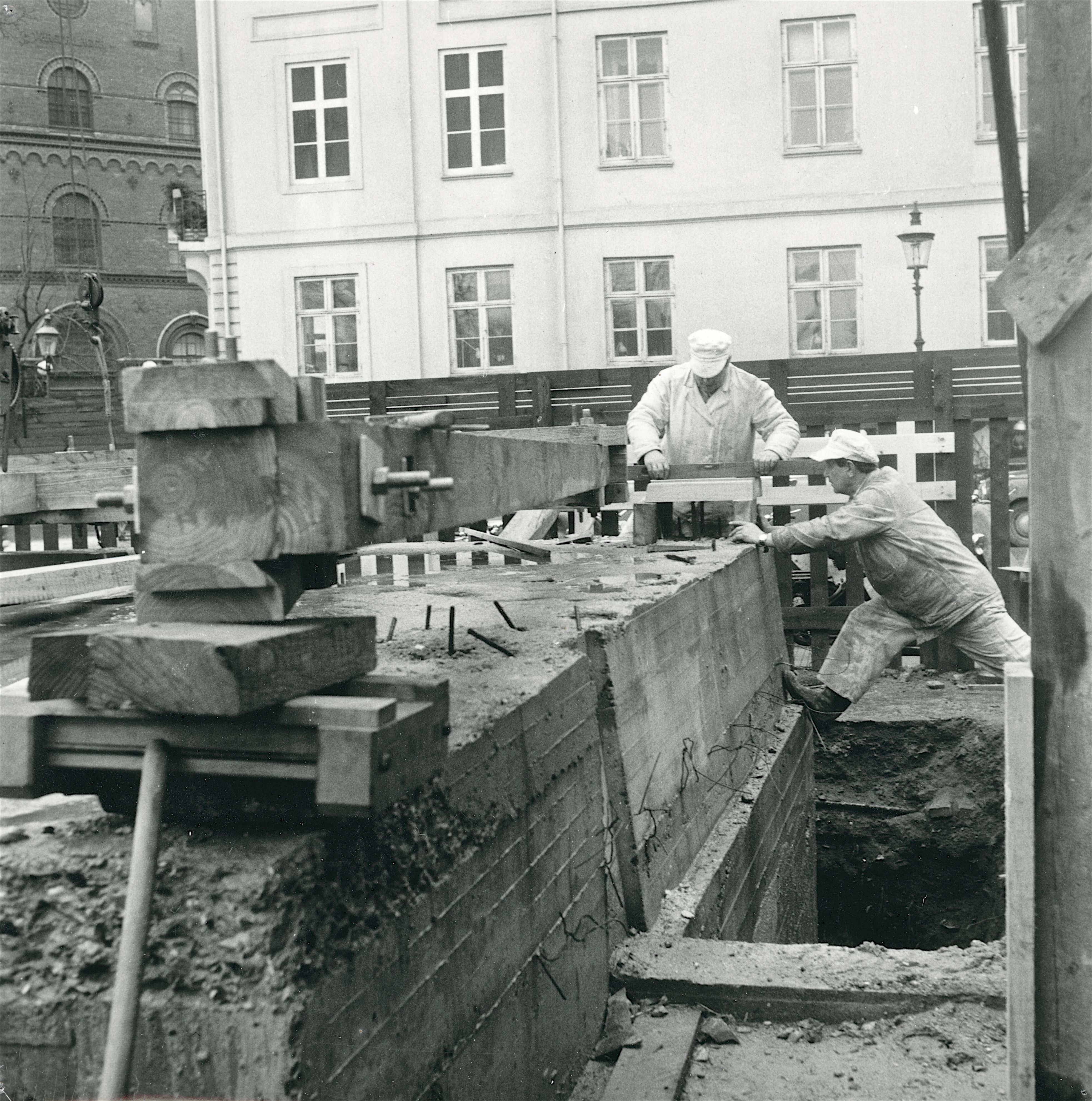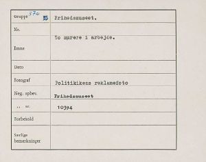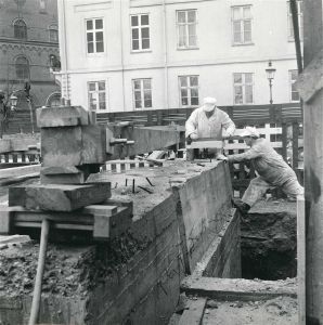 Maskingenkendt tekst fra fotokuvert: To murere i arbejde.