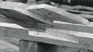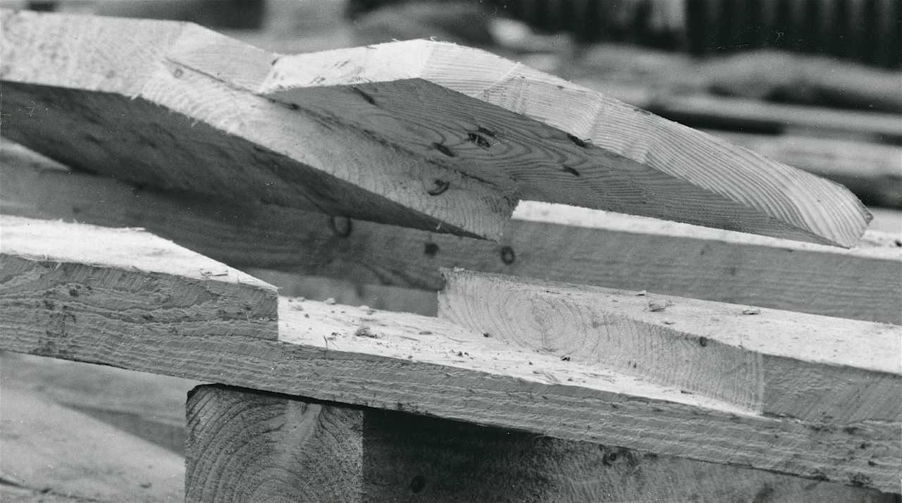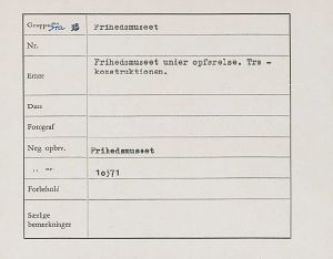 Maskingenkendt tekst fra fotokuvert: Frihedsmuseet under opførelse. Træ -konstruktionen.