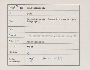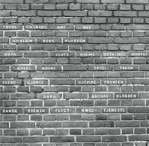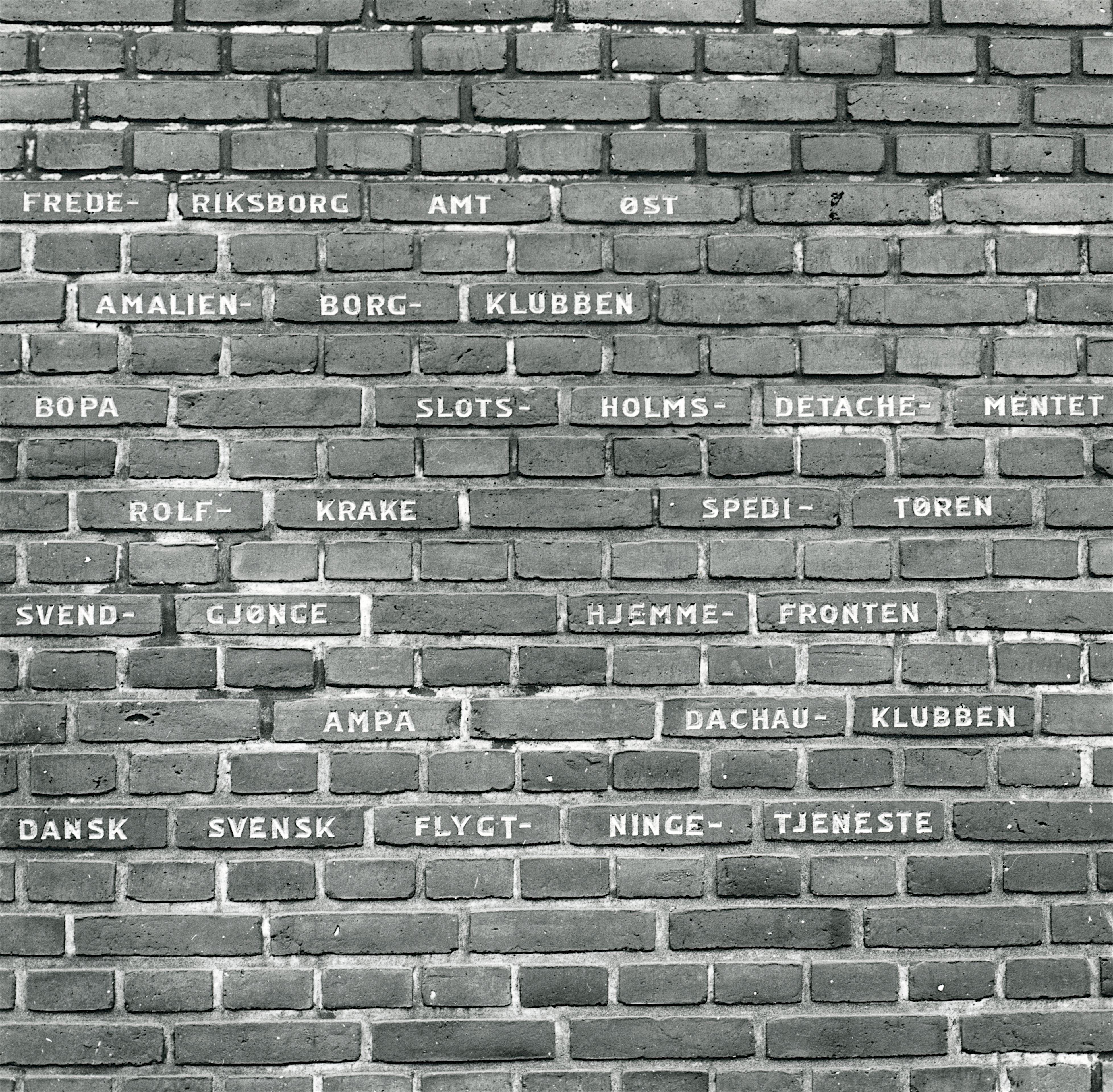 Frihedsmuseets facade med navnene på de modstandsorganisationer, der har bidraget til opførelsen, indfældet i murstenene og forgyldt