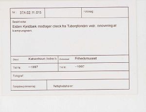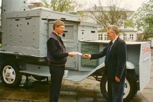 Maskingenkendt tekst fra fotokuvert: Esben Kjeldbæk modtager check fra Tuborgfonden vedr. renovering af kampvognen.