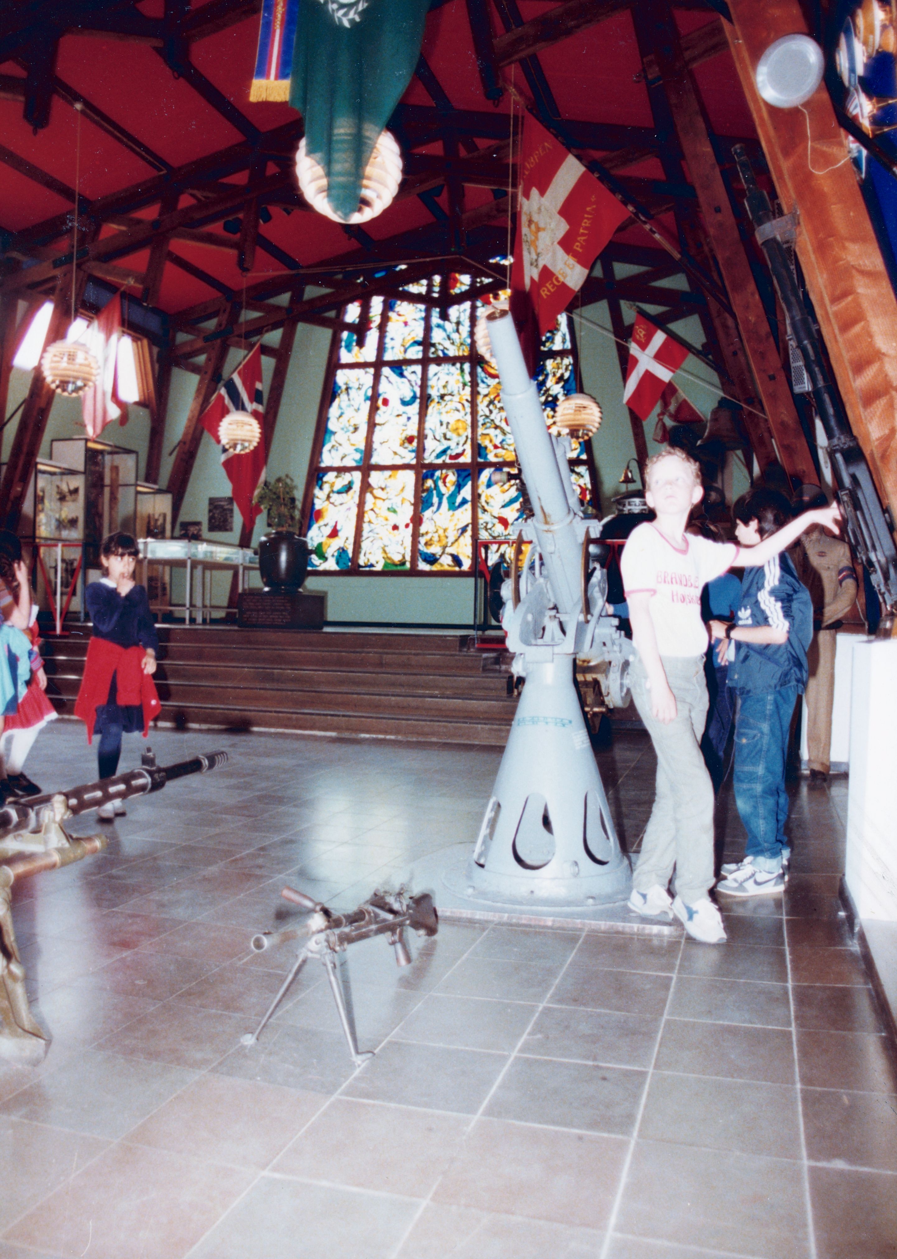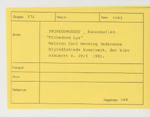Maskingenkendt tekst fra fotokuvert: FRIHEDSMUSEET. Kanonhallen. "Frihedens Lys" Maleren Carl Henning Pedersens Blyindfattede kunstværk, der blev afsløret d. 29/8 1983.