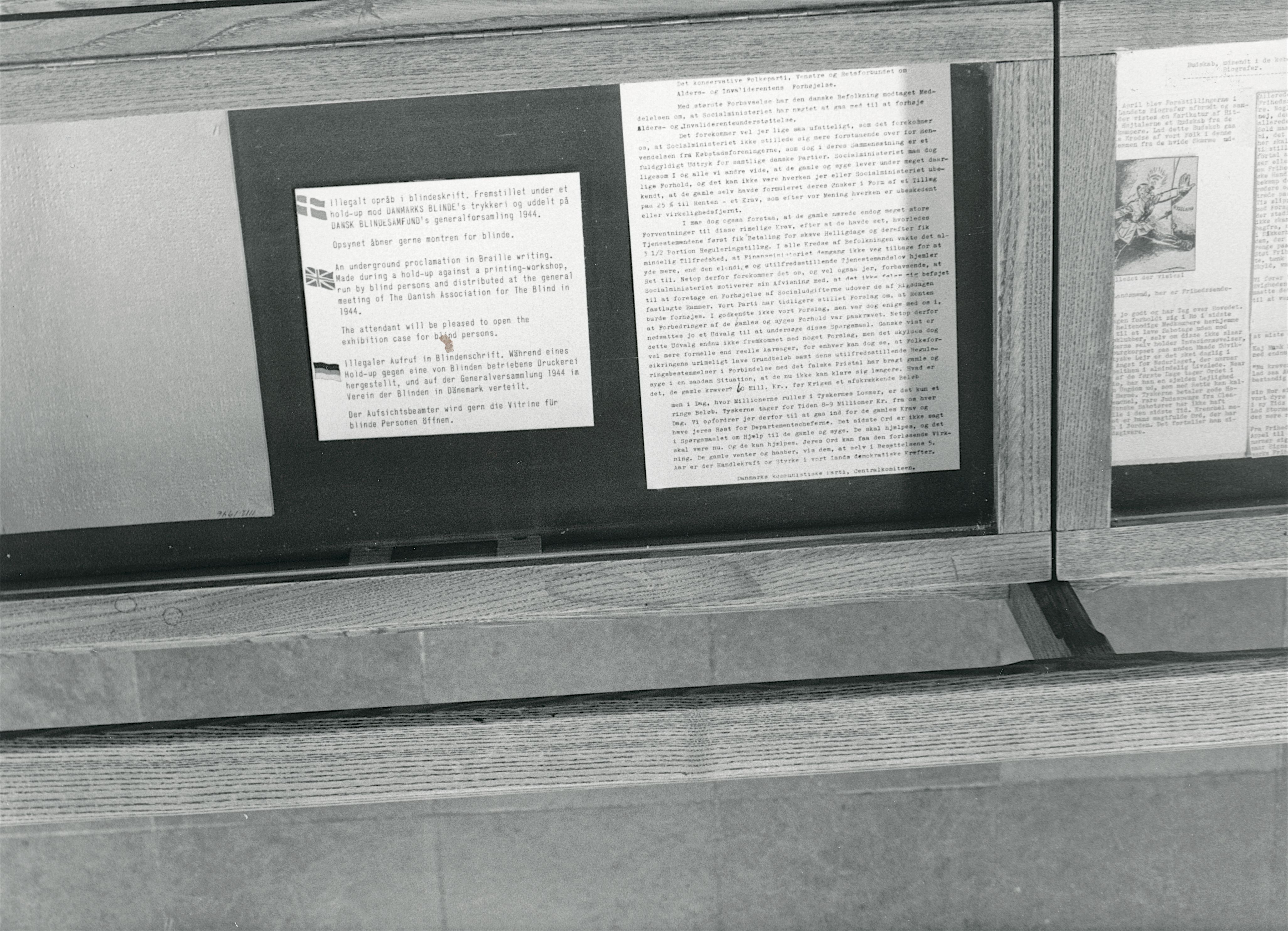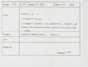 Maskingenkendt tekst fra fotokuvert: Montre nr. 7. Illegale blade. Illegalt opråb i blindskrift, omdelt på Dansk Blindesamfunds generalforsamling i 1944