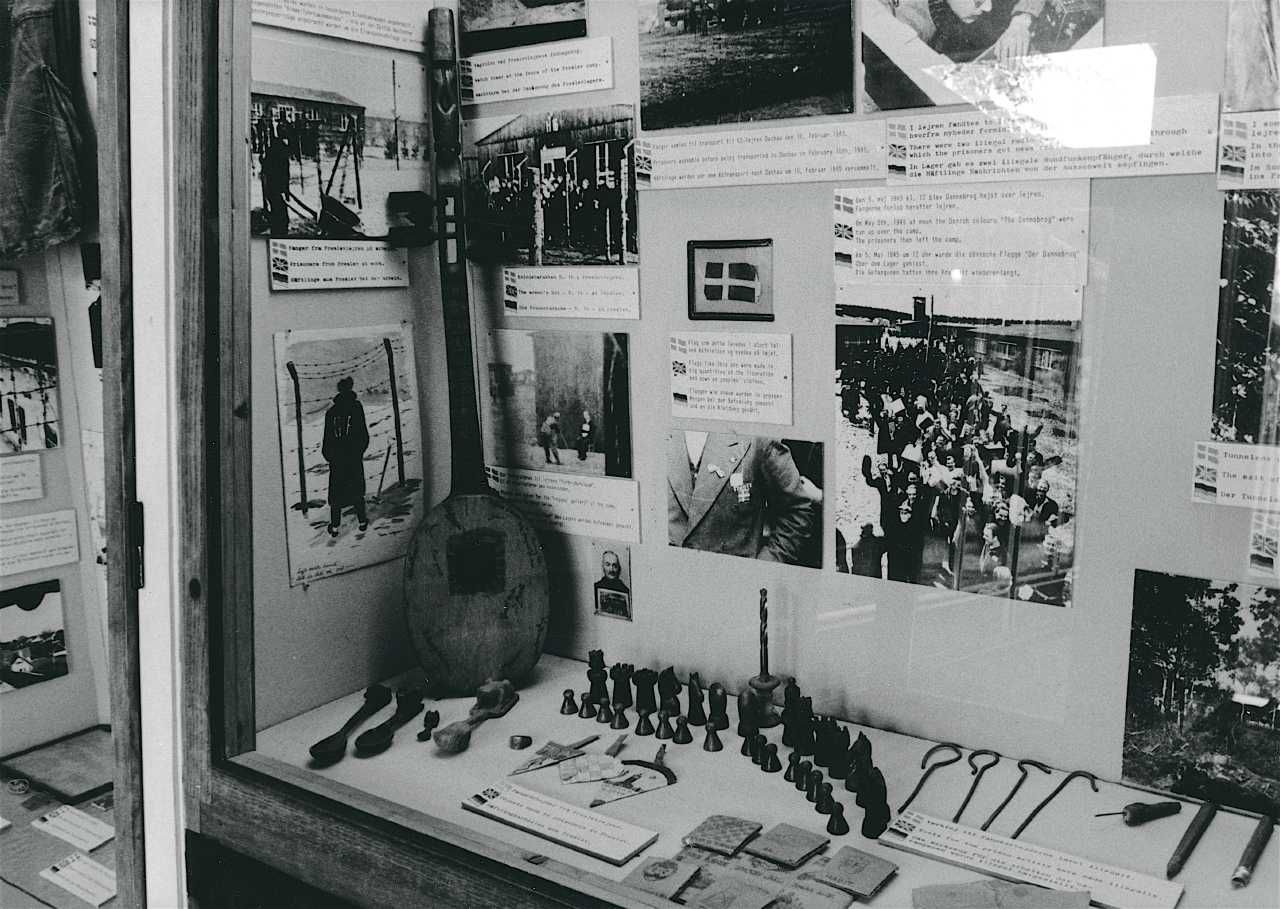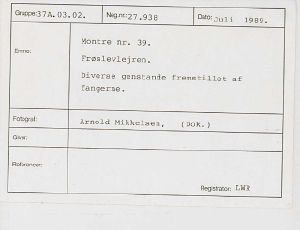 Maskingenkendt tekst fra fotokuvert: Montre nr. 39. Frøslevlejren. Diverse genstande fremstillet af fangerne.