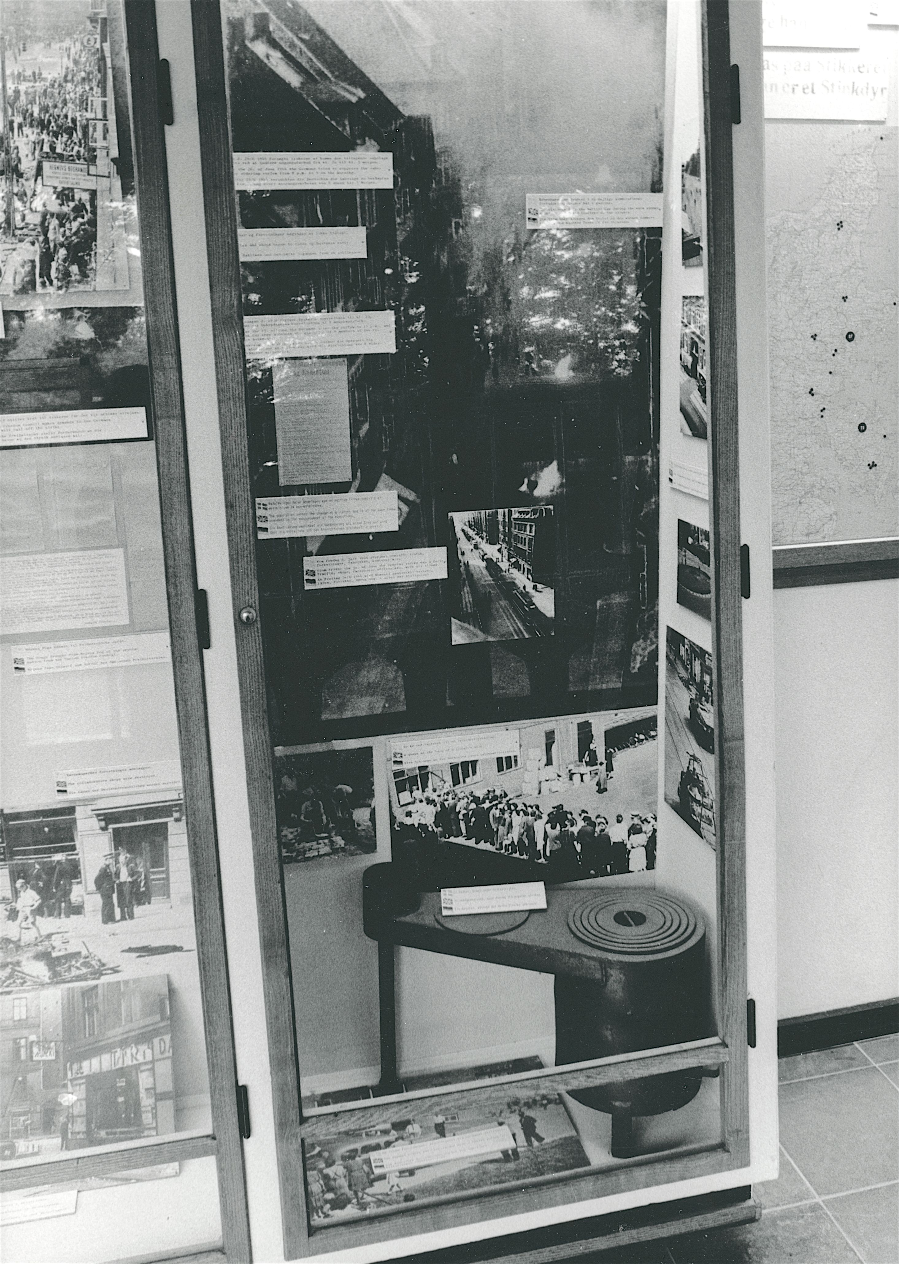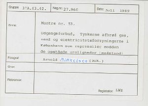 Maskingenkendt tekst fra fotokuvert: Montre nr. 53. Udgangsforbud, Tyskerne afbrød gas, vand og elektricitetsforsyningerne i København som represalier modden de opståede uroligheder (modstand)
