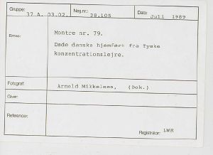 Maskingenkendt tekst fra fotokuvert: Montre nr. 79. Døde danske hjemført fra Tyske konzentrationslejre.