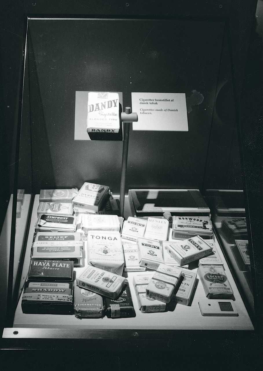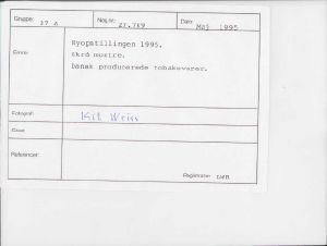 Maskingenkendt tekst fra fotokuvert: Nyopstillingen 1995. Skrå montre. Dansk producerede tobaksvarer.