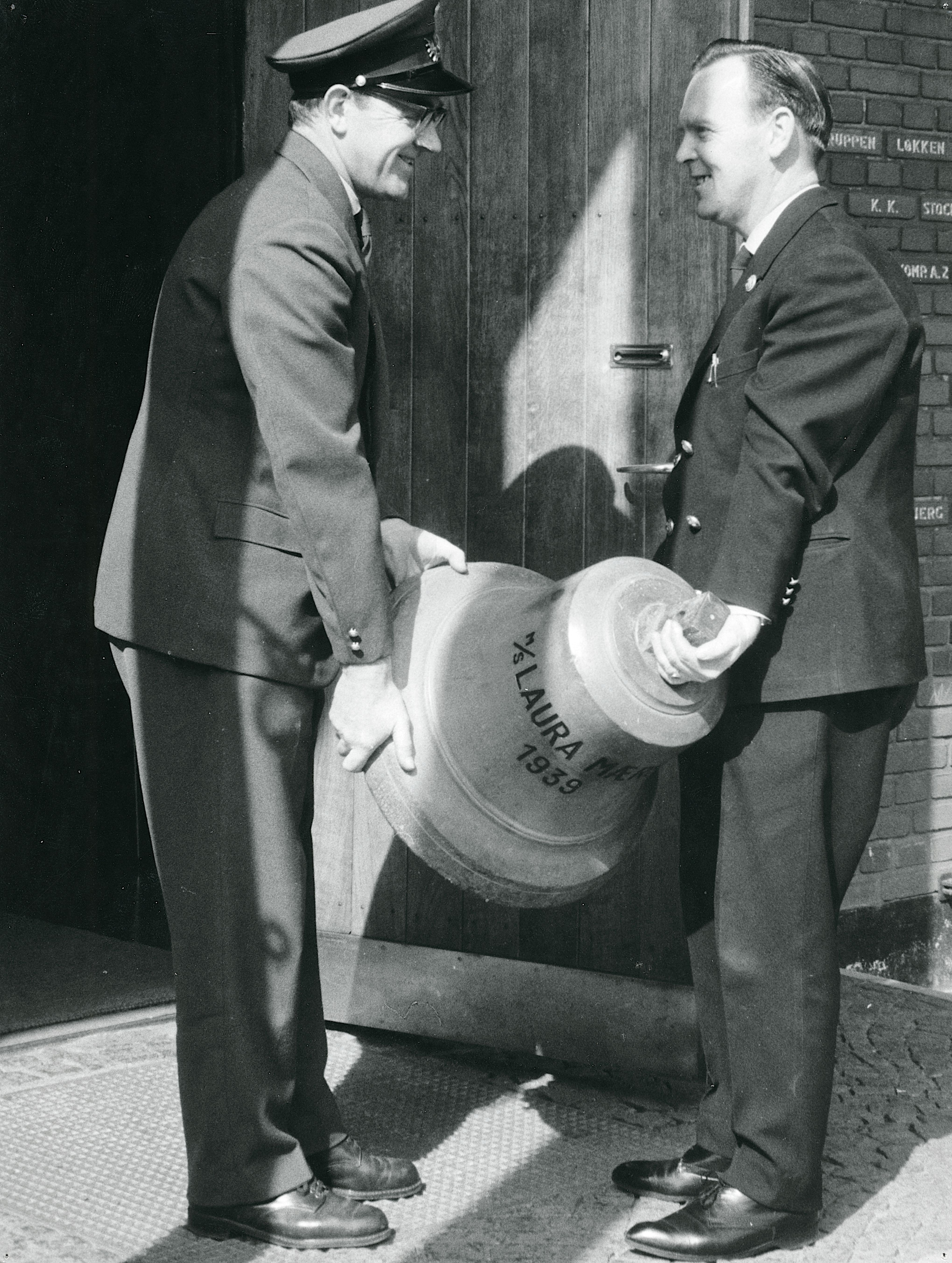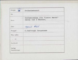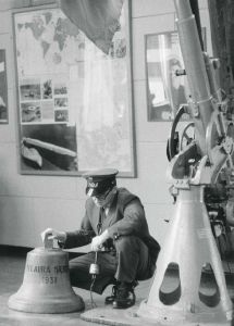 Maskingenkendt tekst fra fotokuvert: Skibsklokken fra "Laura Mærsk" bæres ind i Museet.