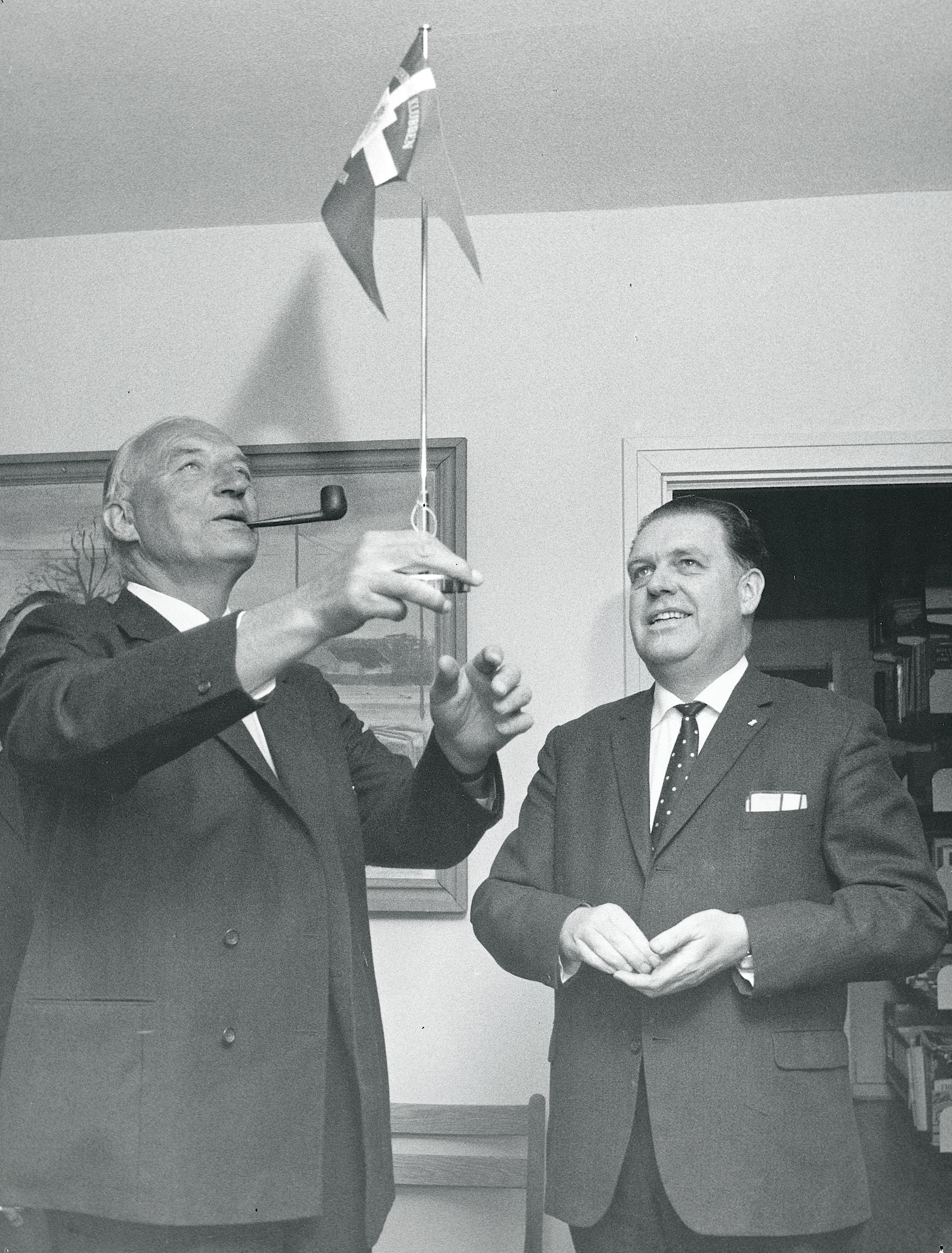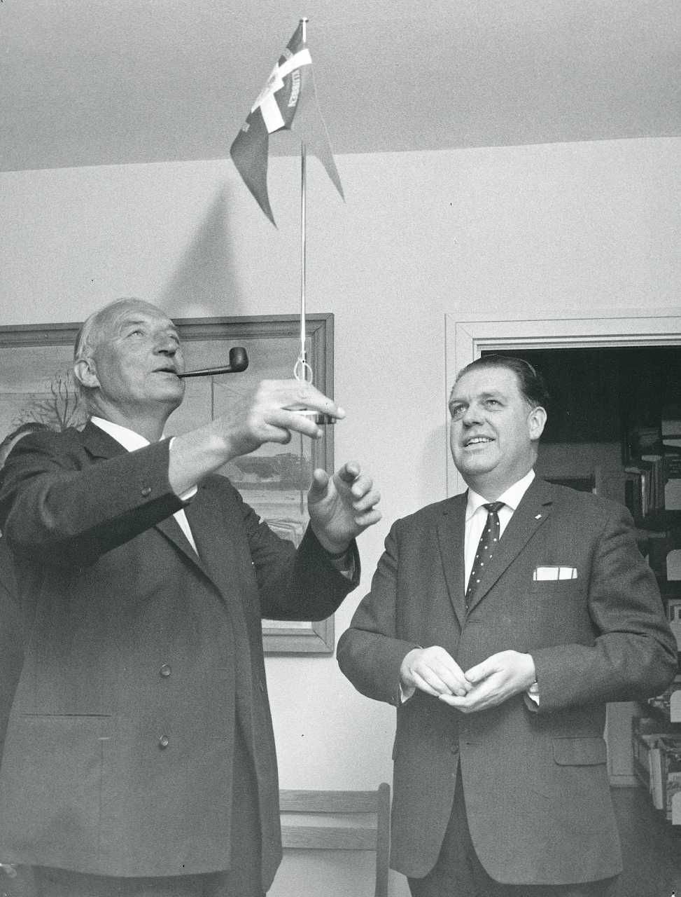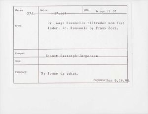 Maskingenkendt tekst fra fotokuvert: Dr. Aage Roussells tiltræden som fast leder. Dr. Roussell og Frank Zorn.