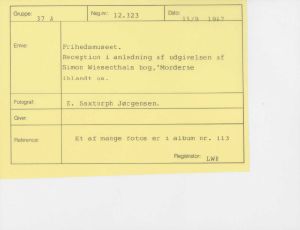 Maskingenkendt tekst fra fotokuvert: Frihedsmuseet. Reception i anledning af udgivelsen af Simon Wiesenthals bog, "Morderne iblandt os".