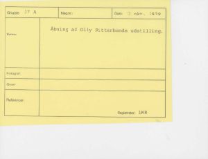 Maskingenkendt tekst fra fotokuvert: Åbning af Olly Ritterbands udstilling.