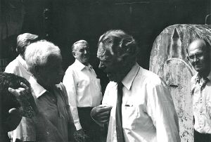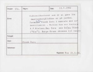 Maskingenkendt tekst fra fotokuvert: Stålskilderhuset som er en gave fra Amalienborgklubben er på jorden. Foran Frank Zorn i samtale med uidentificeret. Mellem dem ses kaptajn N.P.Nielsen. Bag Zorn ses Georg Olsen ("Ole"). Børge Kruse skimtes til venstre