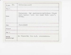 Maskingenkendt tekst fra fotokuvert: Formanden for Amalienborgklubben Frank Zorn holder tale ved Dame Vera Lynns besøg.