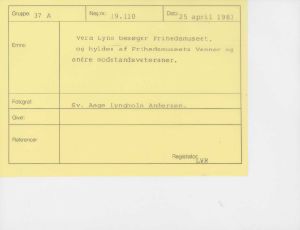 Maskingenkendt tekst fra fotokuvert: Vera Lynn besøger Frihedsmuseet, og hyldes af Frihedsmuseets Venner og andre modstandsveteraner.