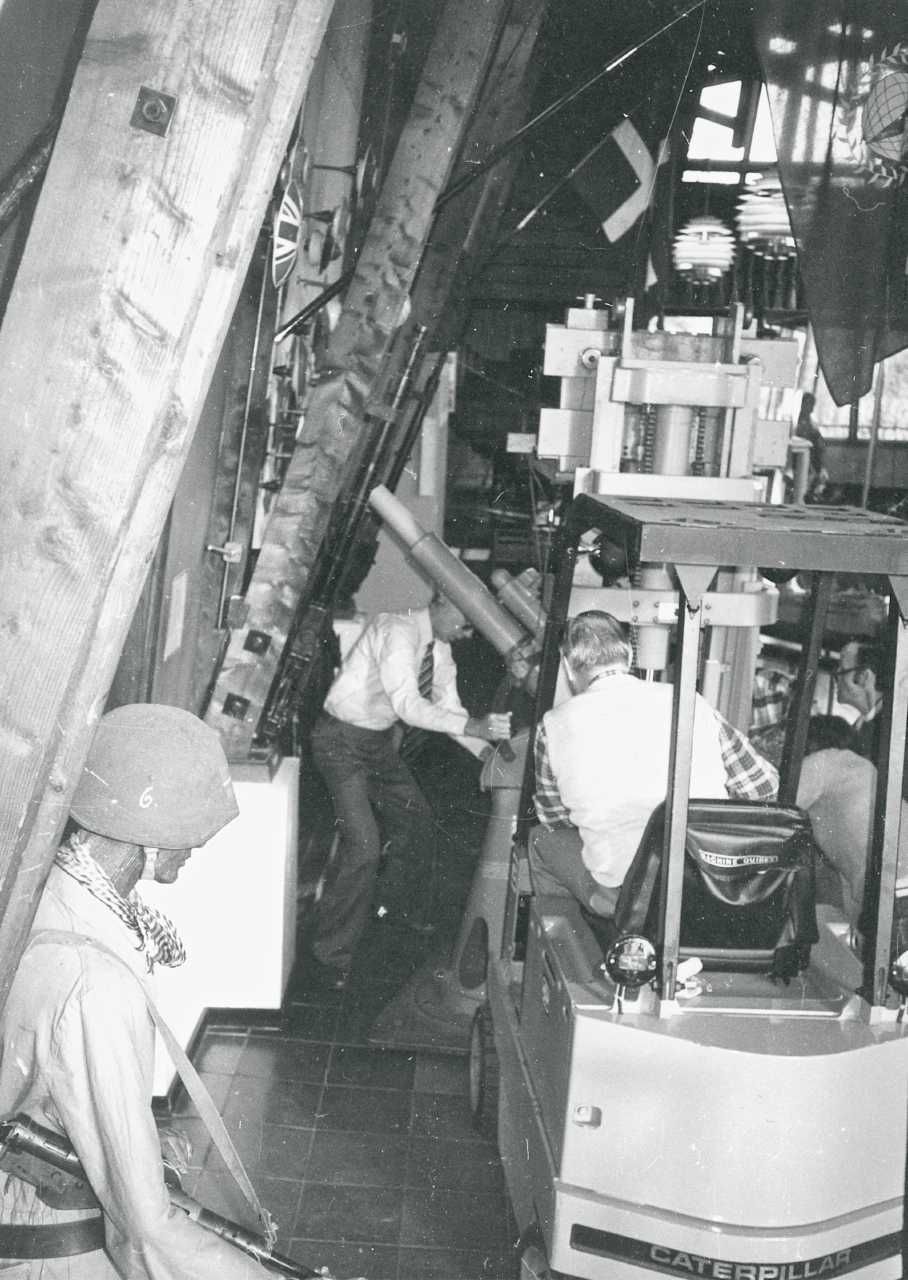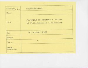 Maskingenkendt tekst fra fotokuvert: Flytning af Kanonen i Hallen på Frihedsmuseet i København