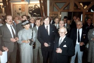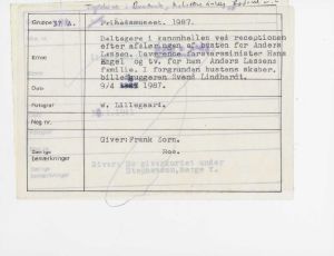 Maskingenkendt tekst fra fotokuvert: Deltagere i kanonhallen ved receptionen efter afsløringen af busten for Anders Lassen. Daværende forsvarsminister Hans Engel og tv for ham Anders Lassens familie. I forgrunden bustens skaber, billedhuggeren Svend Linhardt.