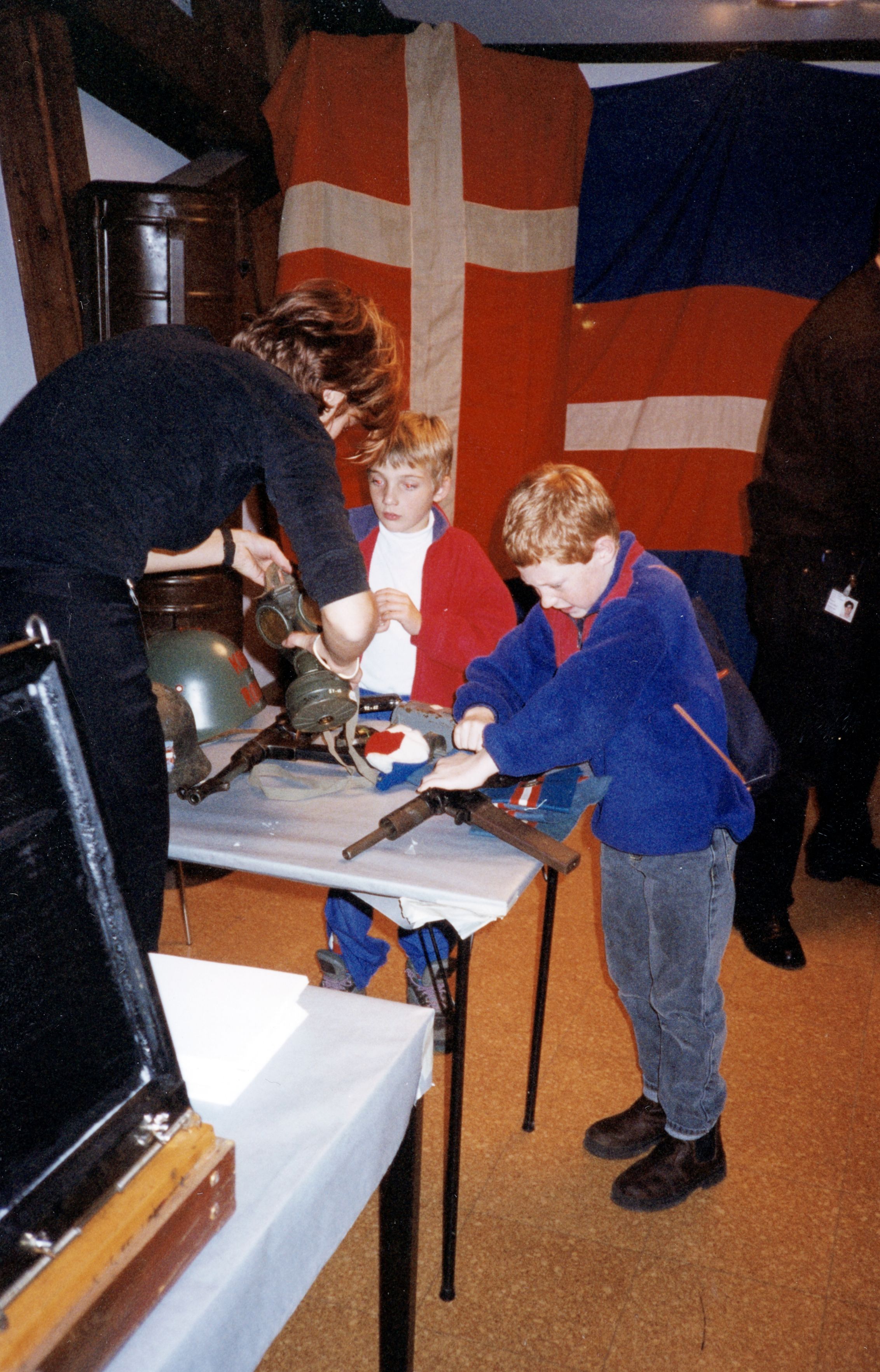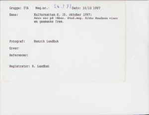 Maskingenkendt tekst fra fotokuvert: Kulturnatten d. 10. oktober 1997 Børn ser på våben. Stud.mag. Rikke Knudsen viser en gasmaske frem.