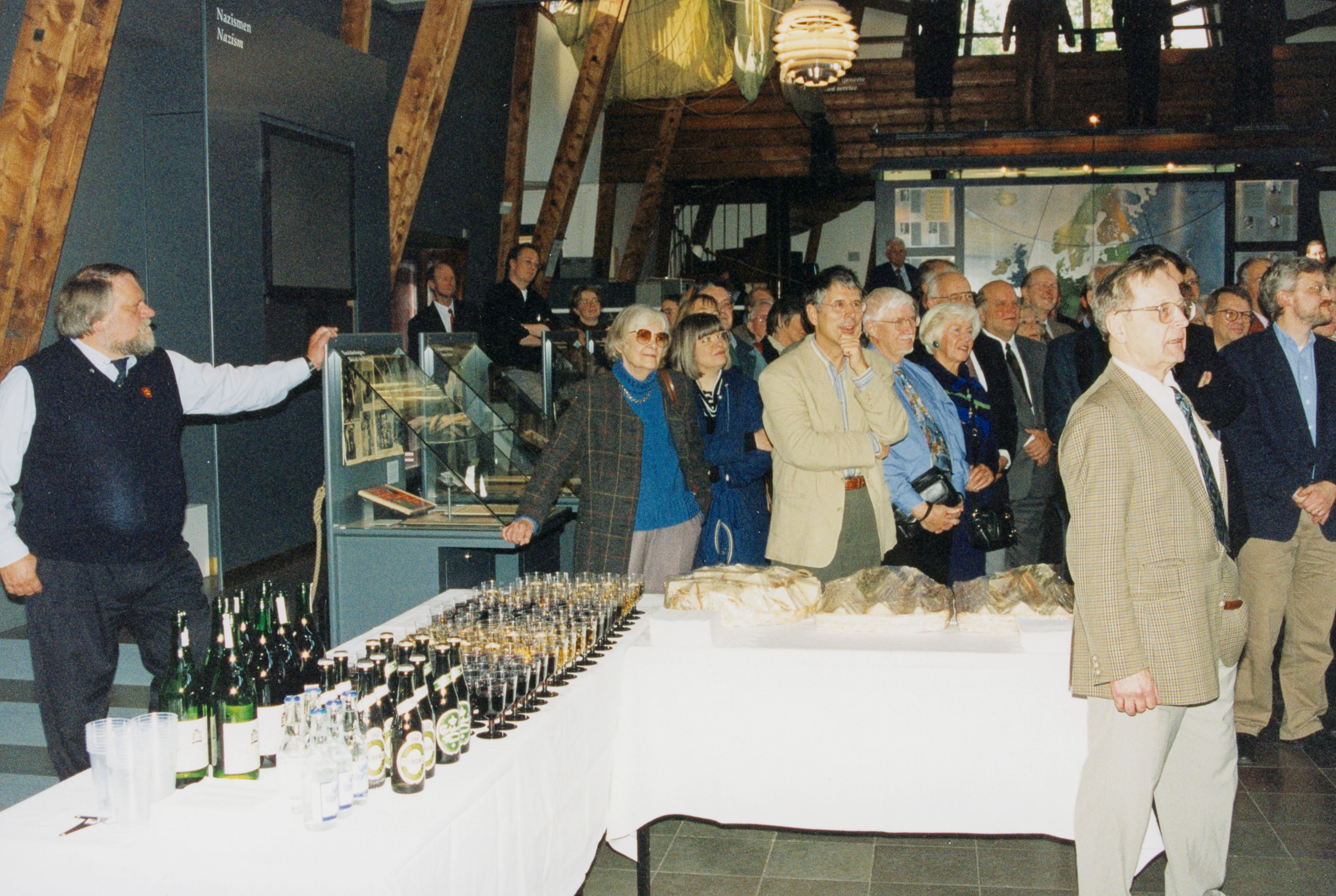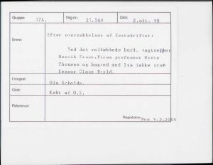 Maskingenkendt tekst fra fotokuvert: Efter overrækkelsen af festskriftet Ved det veldækkede bord. vagtmester Henrik Frost. Foran professor Niels Thomsen og bagved med lys jakke professor Claus Bryld.