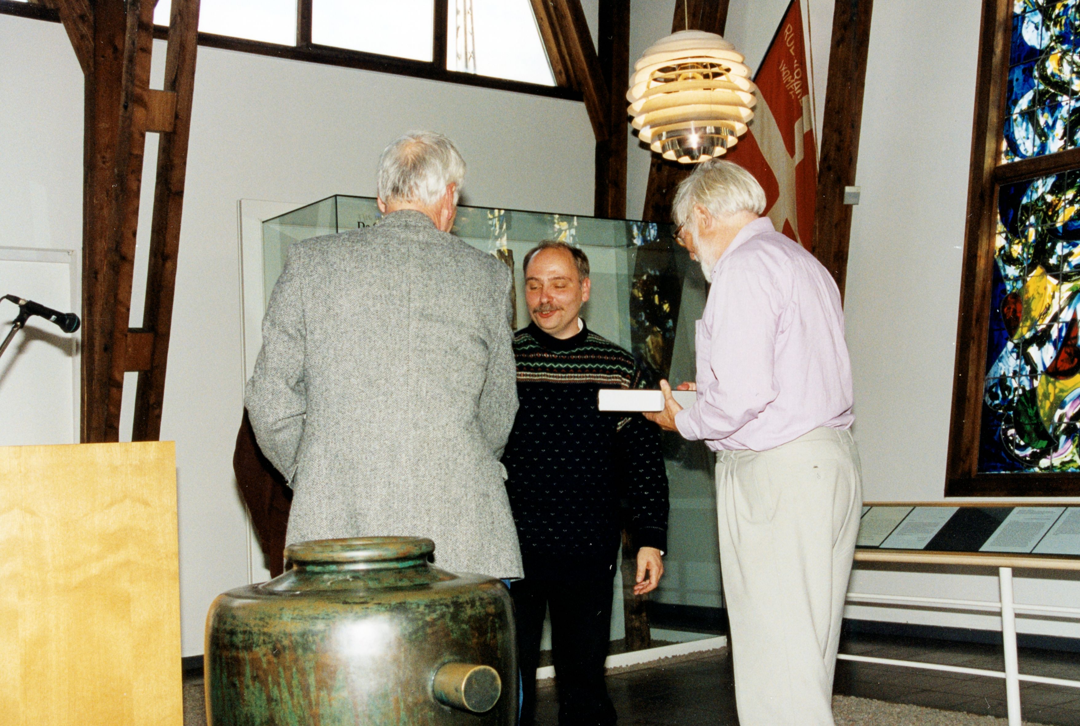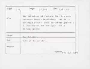 Maskingenkendt tekst fra fotokuvert: Overrækkelsen af festskriftet fra med redaktør Henrik Dethlefsen til de to 65-årige lektor Hans Kirchhoff og Henrik S. Nissen(som her modtager det.) Et højdepunkt!