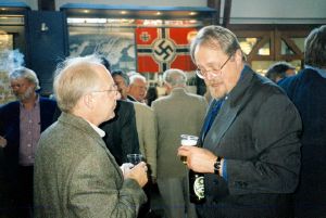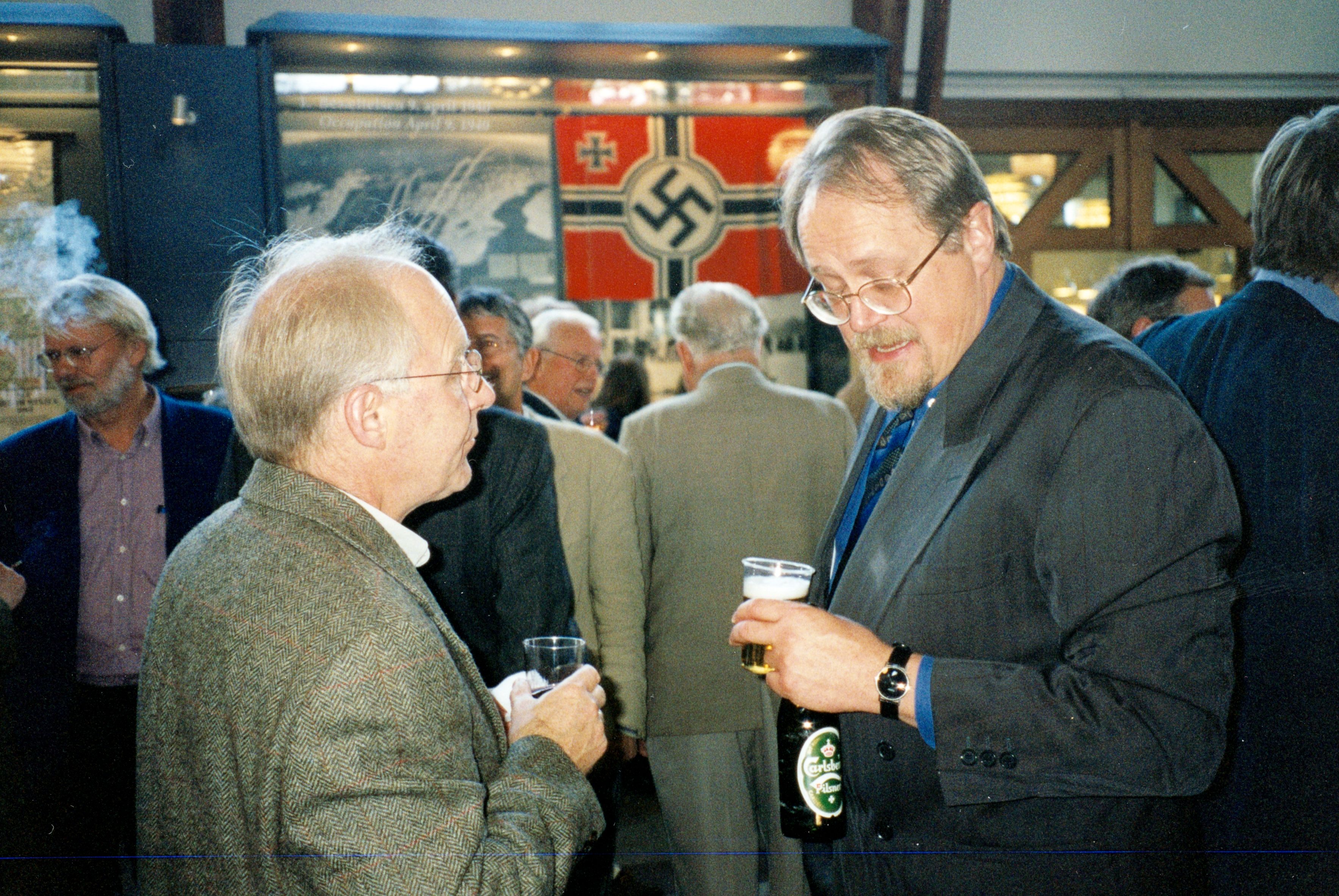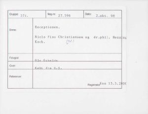 Maskingenkendt tekst fra fotokuvert: Receptionen. Niels Finn Christiansen og dr.phil. Henning Koch.