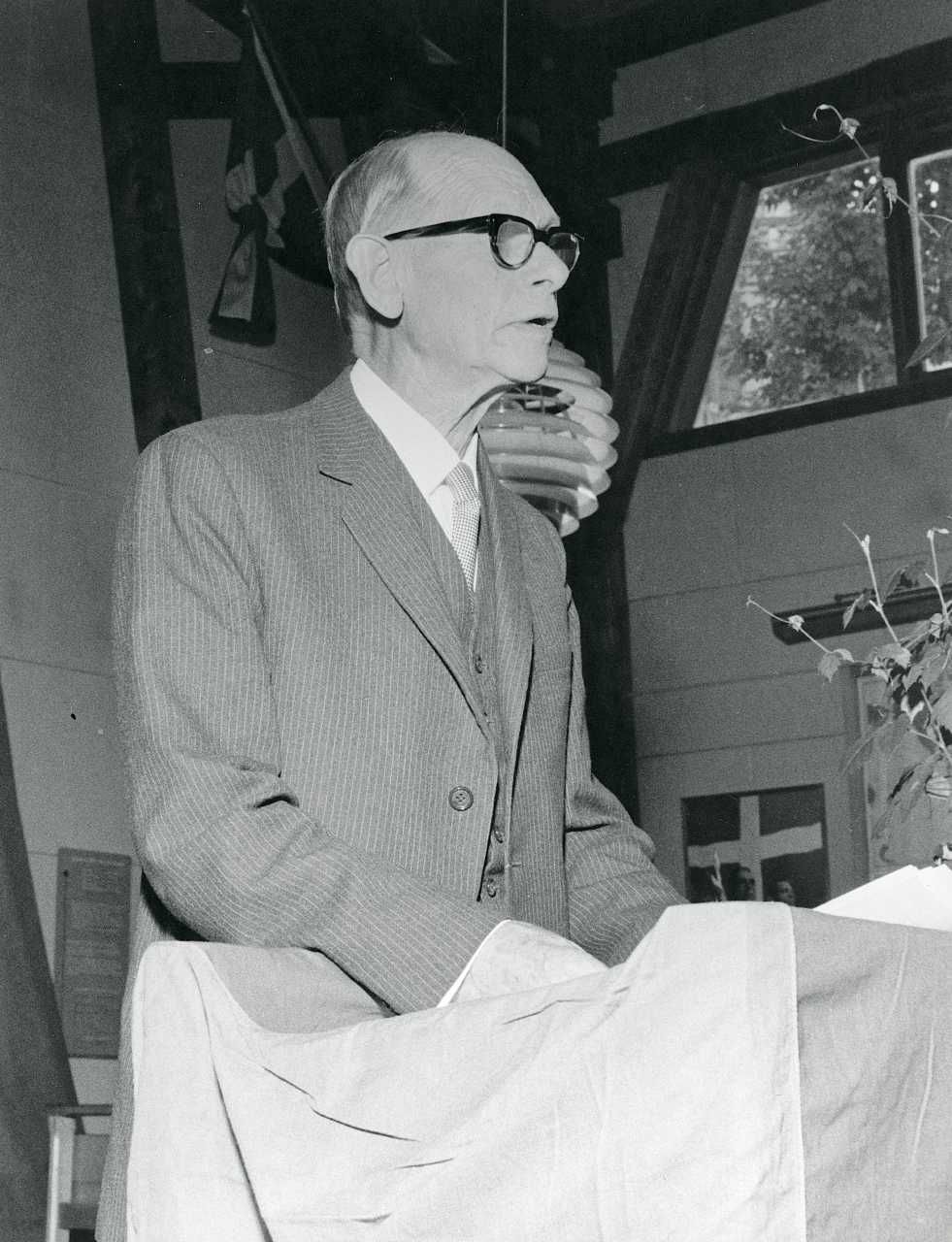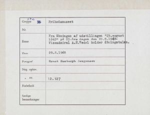 Maskingenkendt tekst fra fotokuvert: Fra åbningen af udstillingen "29.august 1943" På 25-års dagen den 29.8.1948. Viceadmiral A.H.Vedel holder åbningstalen