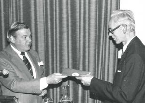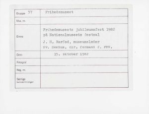 Maskingenkendt tekst fra fotokuvert: Frihedsmuseets jubilæumsfest 1982 på Nationalmuseets festsal J. H. Barfod, museumsleder Sv. Seehus, dir. formand f. FMV.