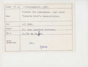 Maskingenkendt tekst fra fotokuvert: Kransen ved kampvognen under "Kulørte "Klat"s demonstration.