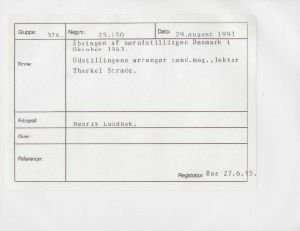 Maskingenkendt tekst fra fotokuvert: Åbningen af særudstillingen Danmark i Oktober 1943. Udstillingens arrangør cand.mag. lektor Therkel Stræde.