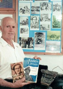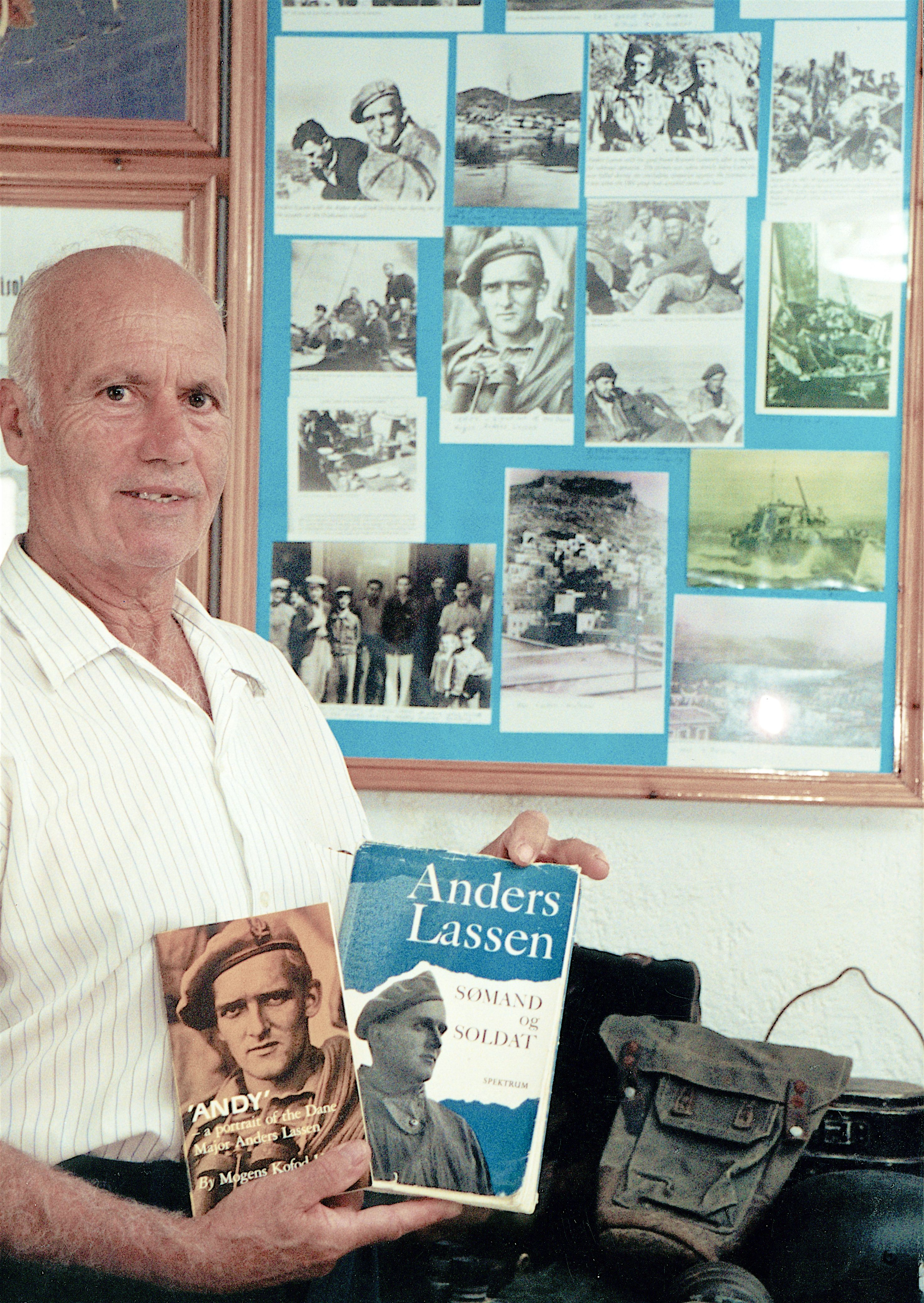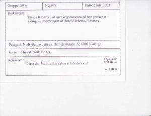 Maskingenkendt tekst fra fotokuvert: Tassos Kanaris i sit eget krigsmuseum på den græske ø Leros, - i underetagen af Hotel Elefteria, Platanos.