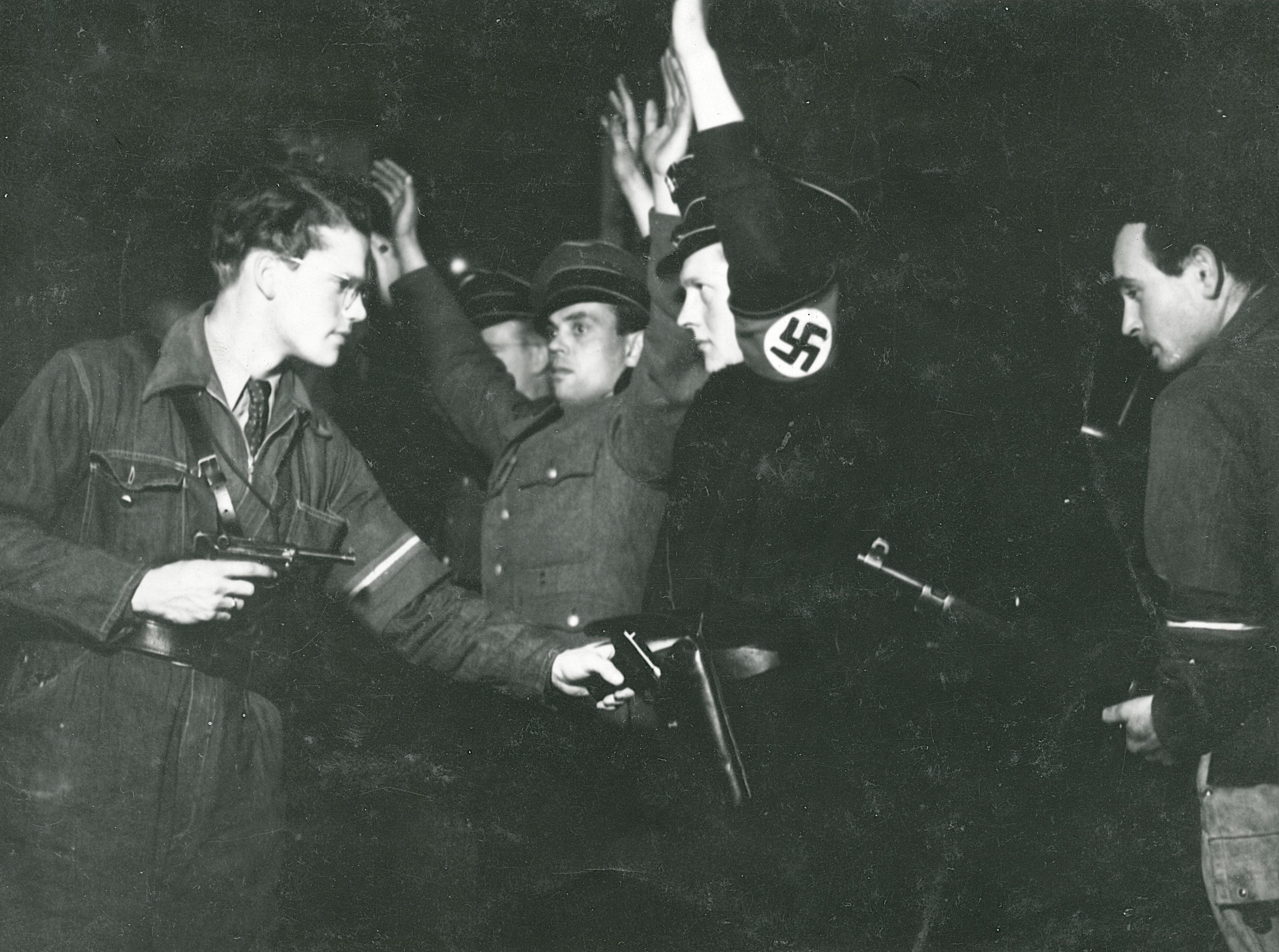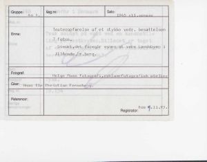 Maskingenkendt tekst fra fotokuvert: Teateropførelse af et stykke vedr. besættelsen 7 fotos. Stedet, det foregår synes at være Landsbyen i Allégade, Fr.berg.