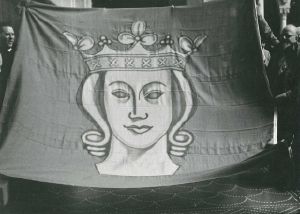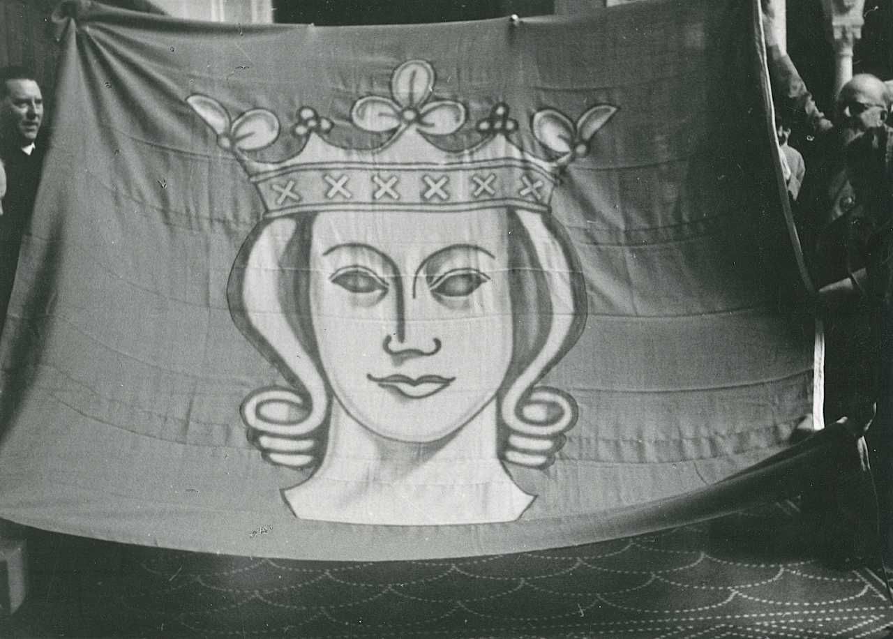 Maskingenkendt tekst fra fotokuvert: Overborgmester Sørensen modtager svenskernes gave Stockholms flag under Raadhusfesten for Svenskerne Sommeren 1945