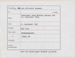 Maskingenkendt tekst fra fotokuvert: København. Kong Haakons ankomst den 22. Sept. 1945.