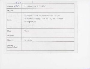 Maskingenkendt tekst fra fotokuvert: Typograferne demonstrerer foran Christiansborg for bl.a. 40 timers arbejdsuge