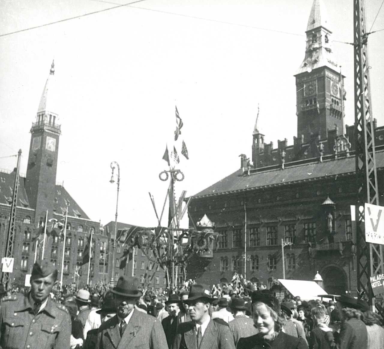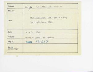 Maskingenkendt tekst fra fotokuvert: Rådhuspladsen, Kbb, under 4-maj festlighederne 1946