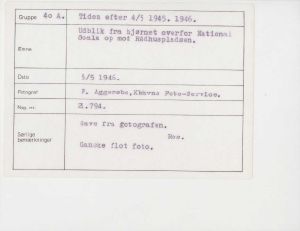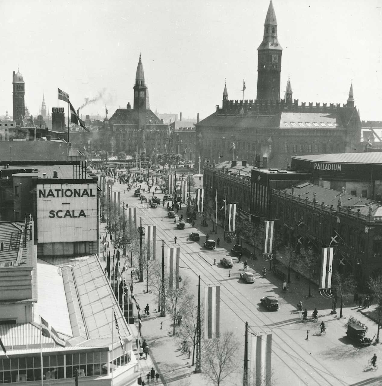 Maskingenkendt tekst fra fotokuvert: Udblik fra hjørnet overfor National Scala op mod Rådhuspladsen.