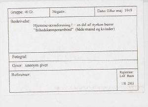 Maskingenkendt tekst fra fotokuvert: Hjemmevæmsforening - en del af styrken bærer "frihedskæmperambind” (både mænd og kvinder)