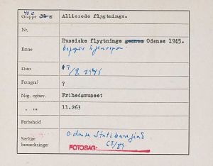 Maskingenkendt tekst fra fotokuvert: Russiske flygtninge Odense 1945.