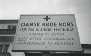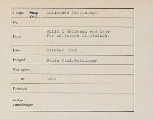 Maskingenkendt tekst fra fotokuvert: Skilt i Hellebæk ved lejr for allierede flygtninge.