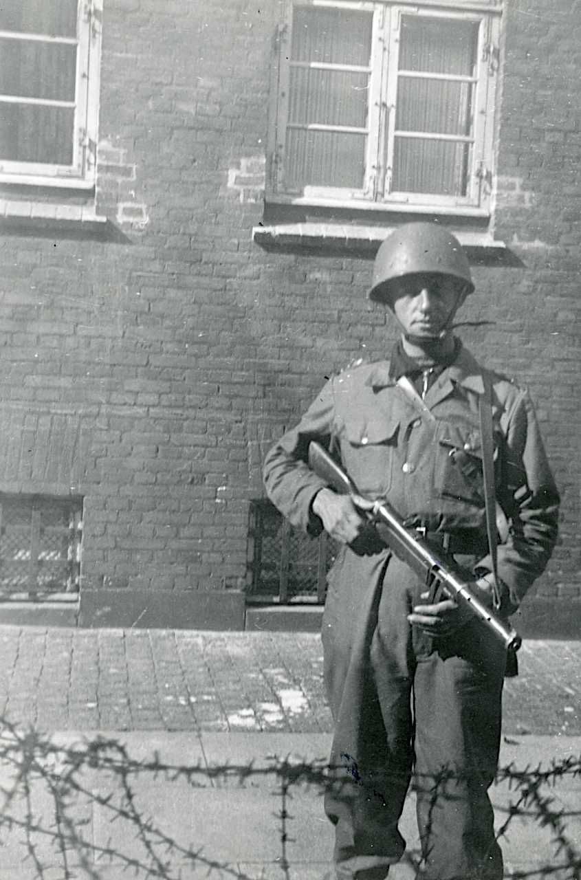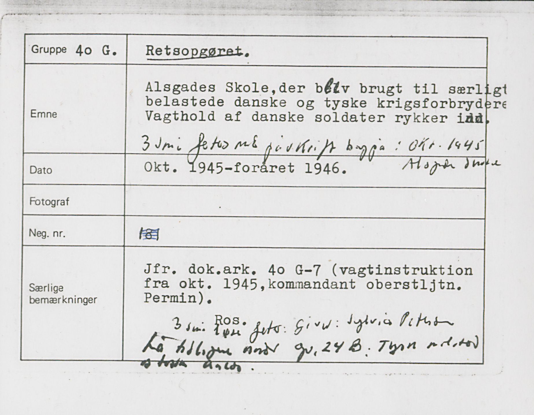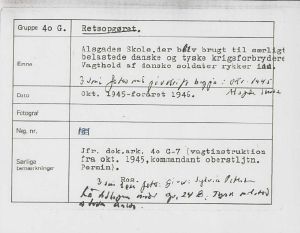 Maskingenkendt tekst fra fotokuvert: Alsgades Skole, der blev brugt til særligt belastede danske og tyske krigsforbrydere. Vagthold af danske soldater rykker ind.