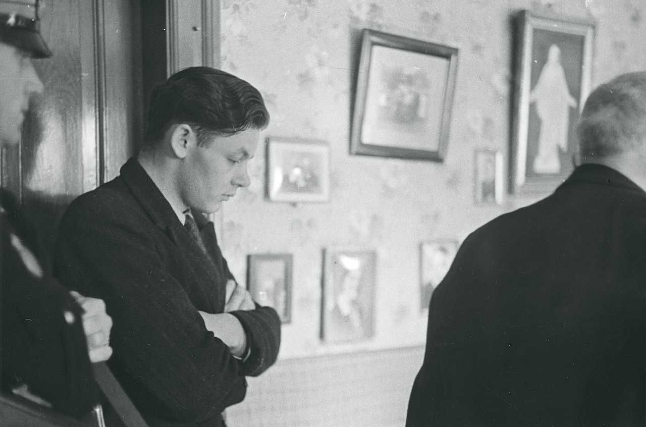 Gestapomanden Erik Laurits Larsen under åstedsforretning på adressen Tværvej 12 i Svendborg i forbindelse med retsopgøret efter befrielsen. Modstandsmanden Vilhelm Rosendal Jensen blev nedskudt og dræbt på adressen d. 10.4.1945.